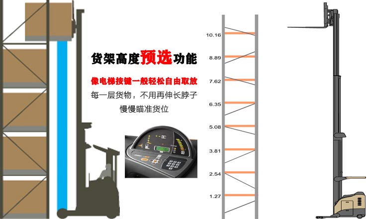 二、創(chuàng)新性的貨架高度預選功能,高位取/放貨輕松高效