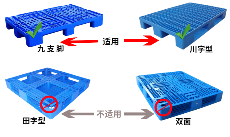 本款叉車只適用于九支腳托盤和川字型托盤,不適用于田字型托盤和雙面托盤。請(qǐng)先確認(rèn)好自己已有托盤底部結(jié)構(gòu)是否適合后,再進(jìn)行下單購(gòu)買。