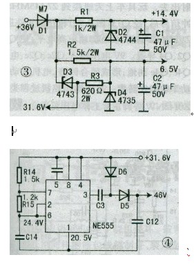 1.穩(wěn)壓電路 :該控制器的穩(wěn)壓電路如圖3所示(圖中 元件位號為自編號)。其電路較簡單,采用電 阻降壓、穩(wěn)壓二極管穩(wěn)壓,此方式已被越來 越多的無刷控制器所采用。     由于該控制器采用了無刷電機(jī)專用控 制芯片MC33035,加之驅(qū)動電路供電由 NE555升壓后供給,所以對穩(wěn)壓電源的輸出 功率要求較低,采用穩(wěn)壓二極管穩(wěn)壓即能滿 足需求。     電池電壓+36V一路經(jīng)R1降壓‘、.c1濾 波后得到約+14.4V電壓,為MC33035DW 及過流、欠壓檢測IC(LM358)供電;另一路 經(jīng)R.2、I)4、C2穩(wěn)壓至6.5V,為轉(zhuǎn)把及霍爾 供電(此電壓在控制器所附的接線說明圖中 標(biāo)注為5V,但實(shí)測為6.5V)。另外,此電源中 31.6V的取法較特殊,利用穩(wěn)壓二極管D3 的穩(wěn)壓特性,將R3和D4上的電壓穩(wěn)壓 為+31.6V,作為NE555的供電電源。圖中 D1為防反接二極管,防止因電池正負(fù)極連 接錯誤損壞電路。     值得一提的是,該電路中的穩(wěn)壓二極管 的型號標(biāo)注分別為4744.、4743、4735,其實(shí)測 穩(wěn)壓值分別為14.4V、12.2V、6.5V。此類穩(wěn)壓 二極管標(biāo)注不同于常規(guī)標(biāo)法,難以通過型號 得知其穩(wěn)壓值。實(shí)修中,可換用相同或相近 穩(wěn)壓值的穩(wěn)壓二極管,但功率應(yīng)不小于1W。