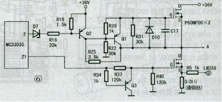 電池電壓經(jīng)R1、R2分壓后加到LM358 ③腳,作為同相輸入信號,MC33035⑧腳輸 出的6.25V基準(zhǔn)電壓直接加到LM358的② 腳,作為反相輸入信號。電池電壓為36V時, LM358⑧腳電壓約7.2V,高于②腳電壓, LM358④腳輸出高電平,D4截止,不影響 MC33035的工作狀態(tài);當(dāng)電池電壓下降至 31 V時,LM358⑧腳電壓將低于6.25V, LM358q)腳輸出低電平,D4導(dǎo)通,MC33035 的@腳電壓降至近0V,電機(jī)停轉(zhuǎn),以防止蓄 電池過度放電o